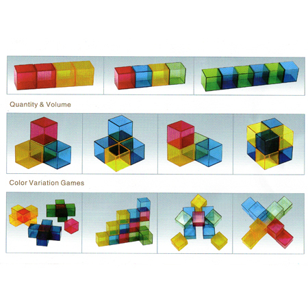 Estos patrones permiten crear formas, ordenar y contar. Lo que contribuye enormemente a la comprensión matemática temprana en el niño. Con estos cubos de colores se pueden crear series que formen áreas, volumen y unidades.